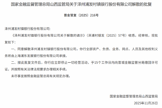 12月2日金融一线消息,国家金融监督管理总局山西监管局发布关于泽州浦发村镇银行股份有限公司解散的批复,同意解散泽州浦发村镇银行股份有限公司七星配资 ,泽州浦发村镇银行全部资产、负债、业务、网点、人员及其他权利义务将由上海浦东发展银行股份有限公司承接。